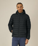 100% Recycled nylon. Men’s padded jacket. Medium fit. Set-in sleeve. High collar with a grown-on hood. Adjustable hood opening and bottom hem with plastic stopper and elastic cord. Reverse nylon zip at centre front. Zipped welt pockets with extra grosgrain puller. Fully quilted. Side panels for a better shape. Self-fabric elasticated cuff. Inside seams with binding finish.